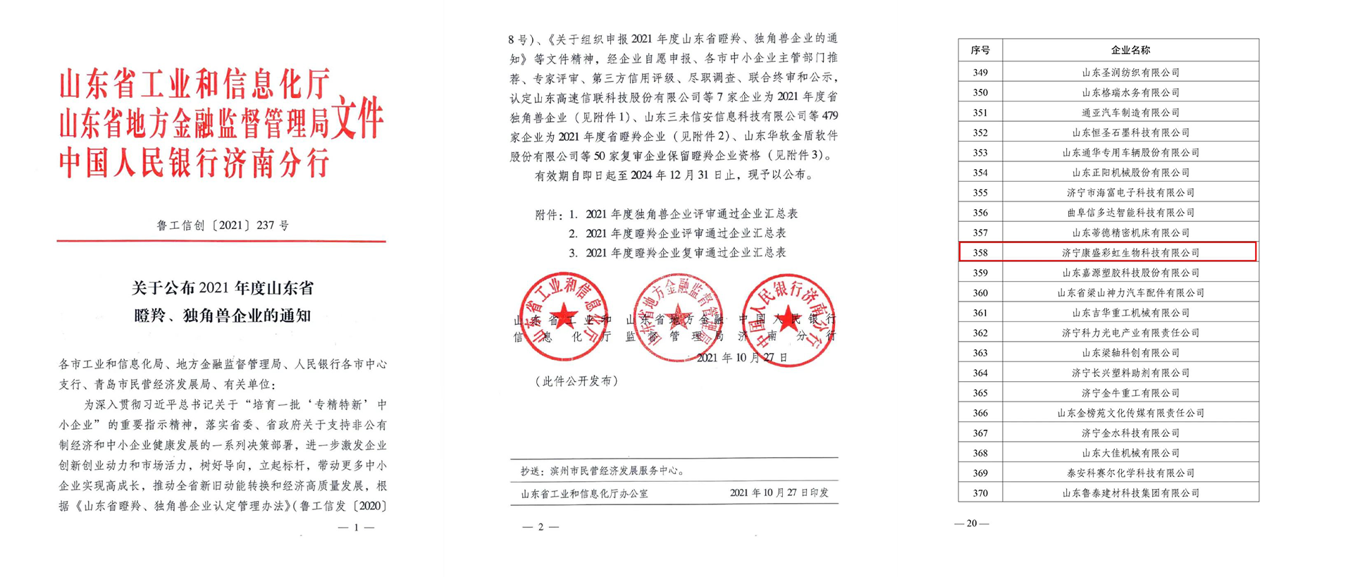 2021年10月27日,山東省工業(yè)和信息化廳公布了“山東省2021年度瞪羚企業(yè)”名單,濟寧康盛彩虹生物科技有限公司名列榜中。這一榮譽標志著康盛彩虹被認定為成長性好、具有跳躍式發(fā)展態(tài)勢的高新技術(shù)企業(yè)。